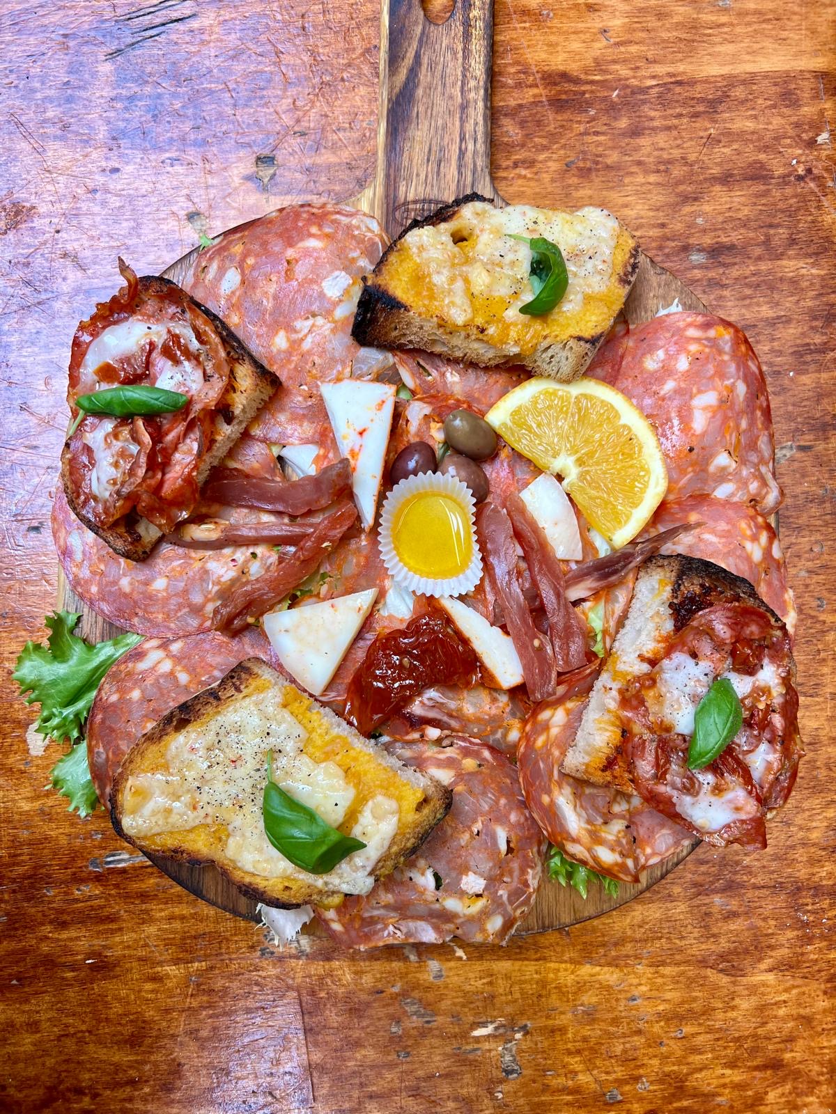 La nostra specialità sono i cesti e i taglieri misti con affettati, formaggi e porchetta. Prosciutto di Norcia, mortazza coi pistacchi, ventricina teramana, pecorino di Campotosto, caciotta di capra, caciofiore e anche selvaggina come cinghiale, cervo e cavallo.