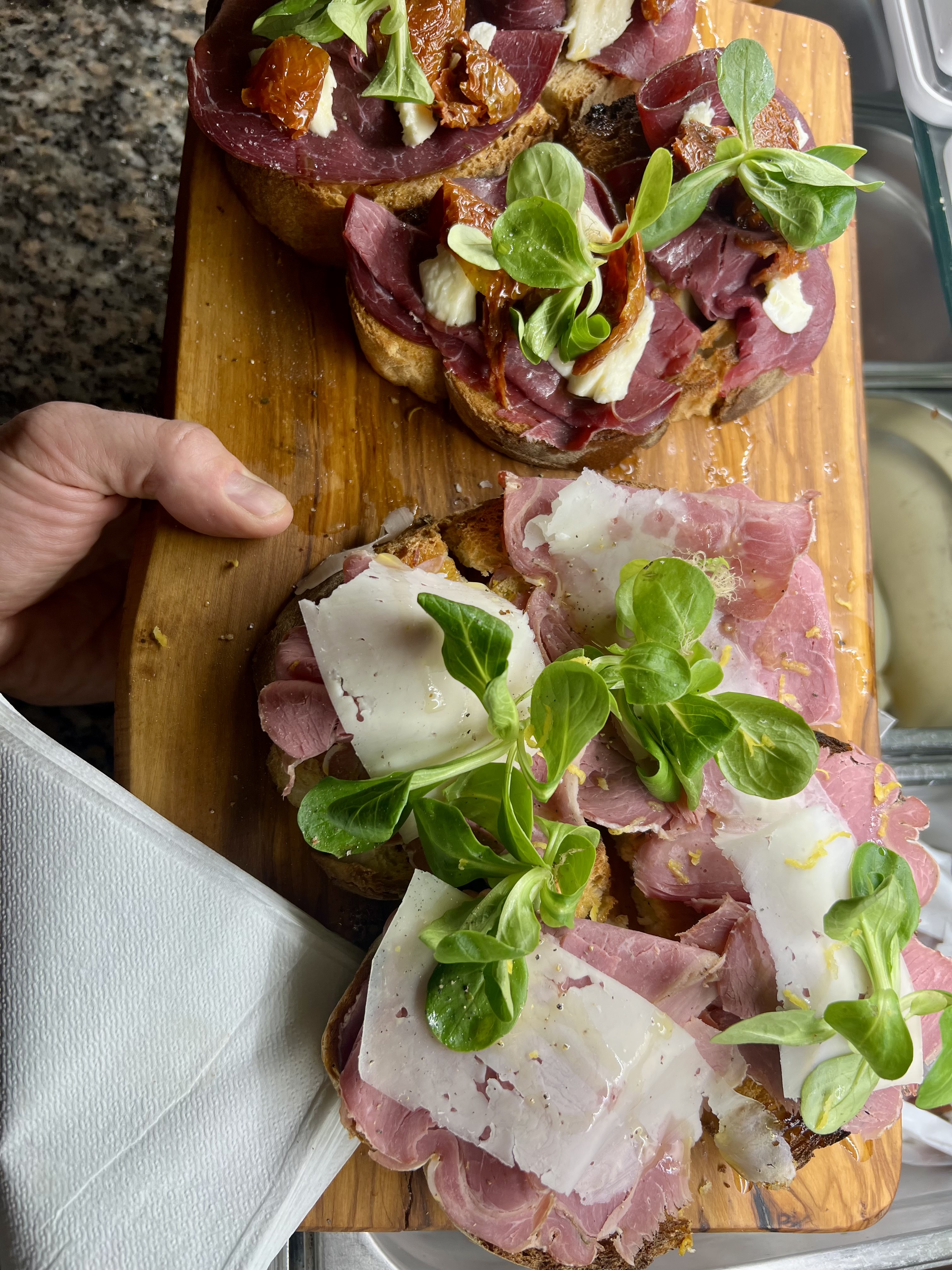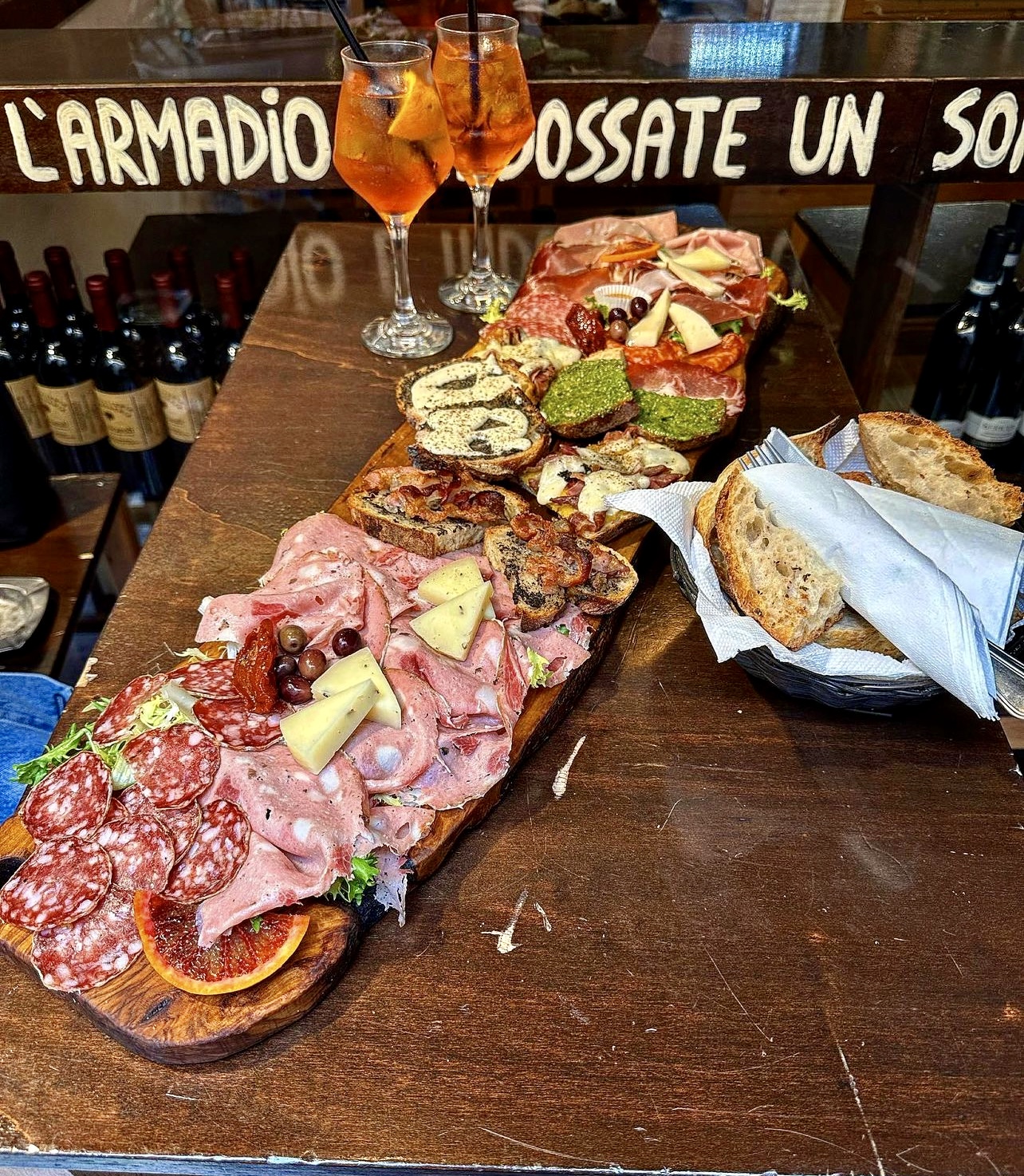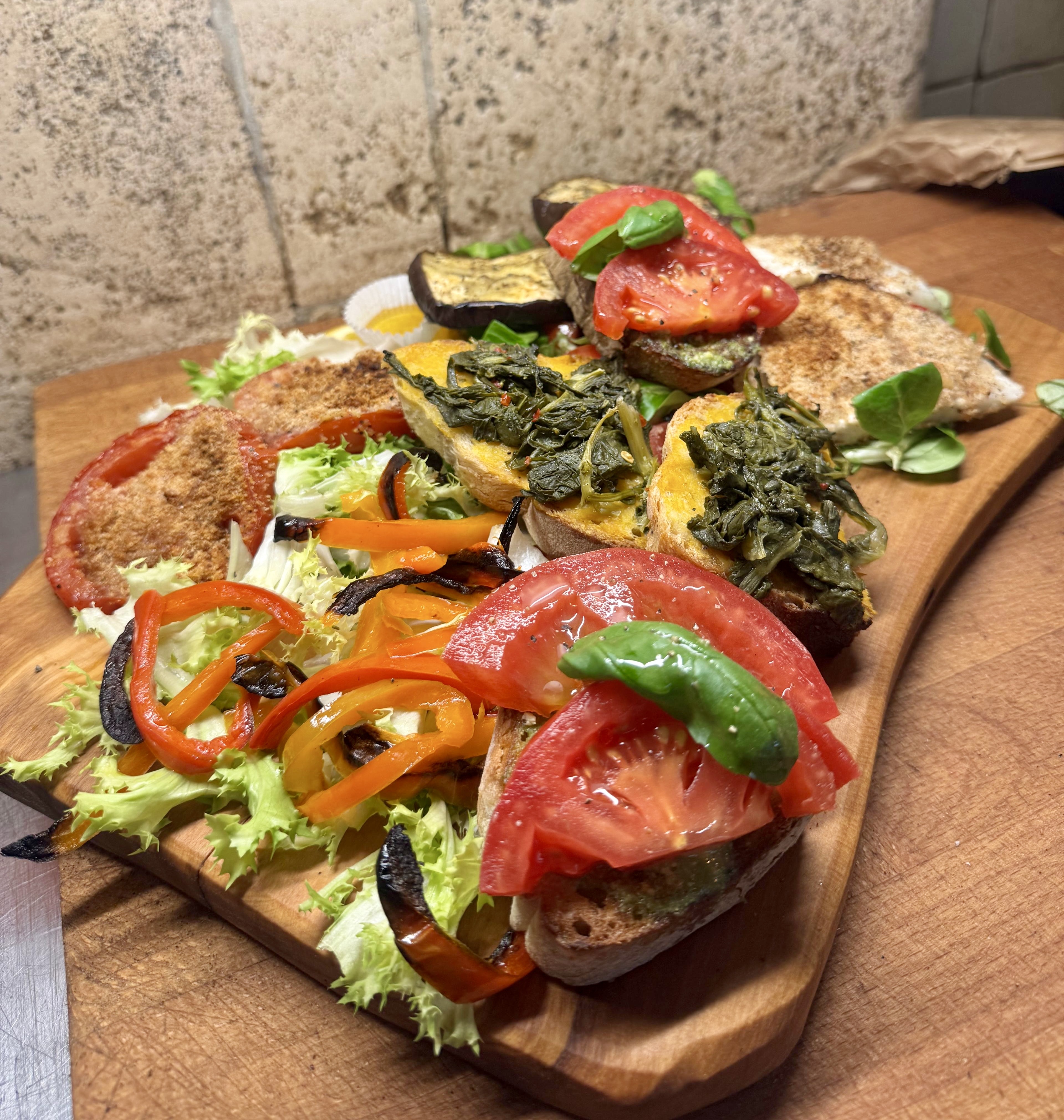 Se non te va il cesto misto te prendi un bel bruschettone, due fette di pane abbruscato con ogni ben di Dio.